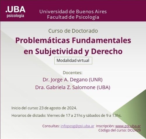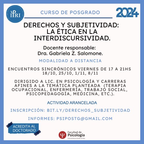 - Curso para graduados «Sujeto del derecho y campo subjetivo: reflexiones éticas sobre prácticas en la interdiscursividad con niñas, niños y adolescentes», dictado por Gabriela Z. Salomone. Organizado por la Secretaría de Investigación, Posgrado y RRII @inposri.psico.unmdp . Subsecretaria de Posgrado, Lic. Rocío Cataldo. 2023.